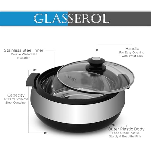Jaypee Glasserol casserole is crafted out of best materials with elegant chrome plated top break resistant knob and a transparent unbreakable glass lid. Now you can cook and display with pride the appetising food with your fine finish simultaneously garnish and flourish with special toppings. A safety hole in the glass lid not only makes it antilock it also lets out the aroma. The inner container is made out of non-magnetic stainless steel sheet. The plastic outer body is moulded out of virgin food grade plastic with a beautiful finish. With a unique chrome finish it gives a sophisticated look which is one of the superlative essential in your kitchen collections. Material Used: Top-PP Ring-ABS(chrome plated) Base-PP Container-Stainless steel and insulation is of polyurethane material. Food grade BPA Free.