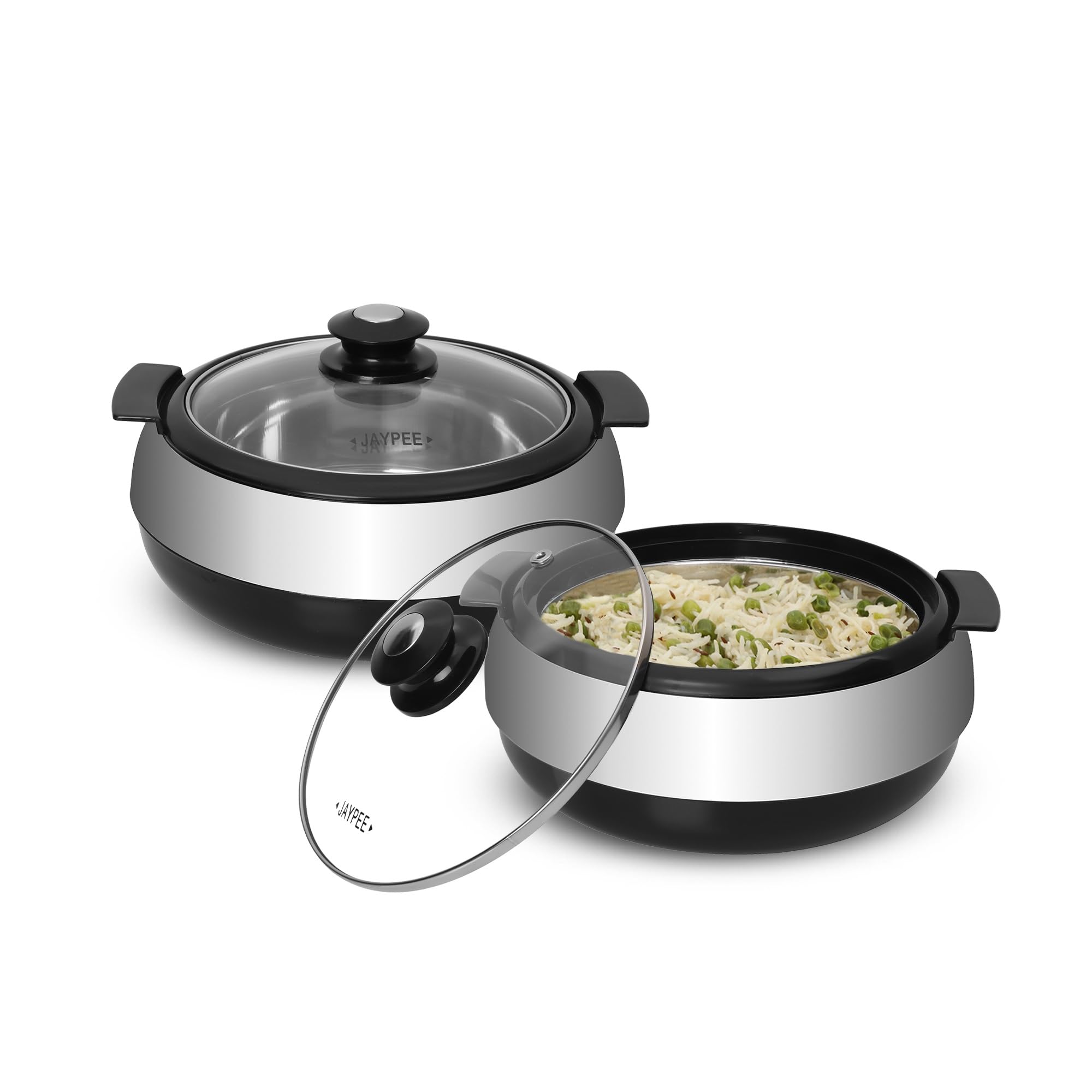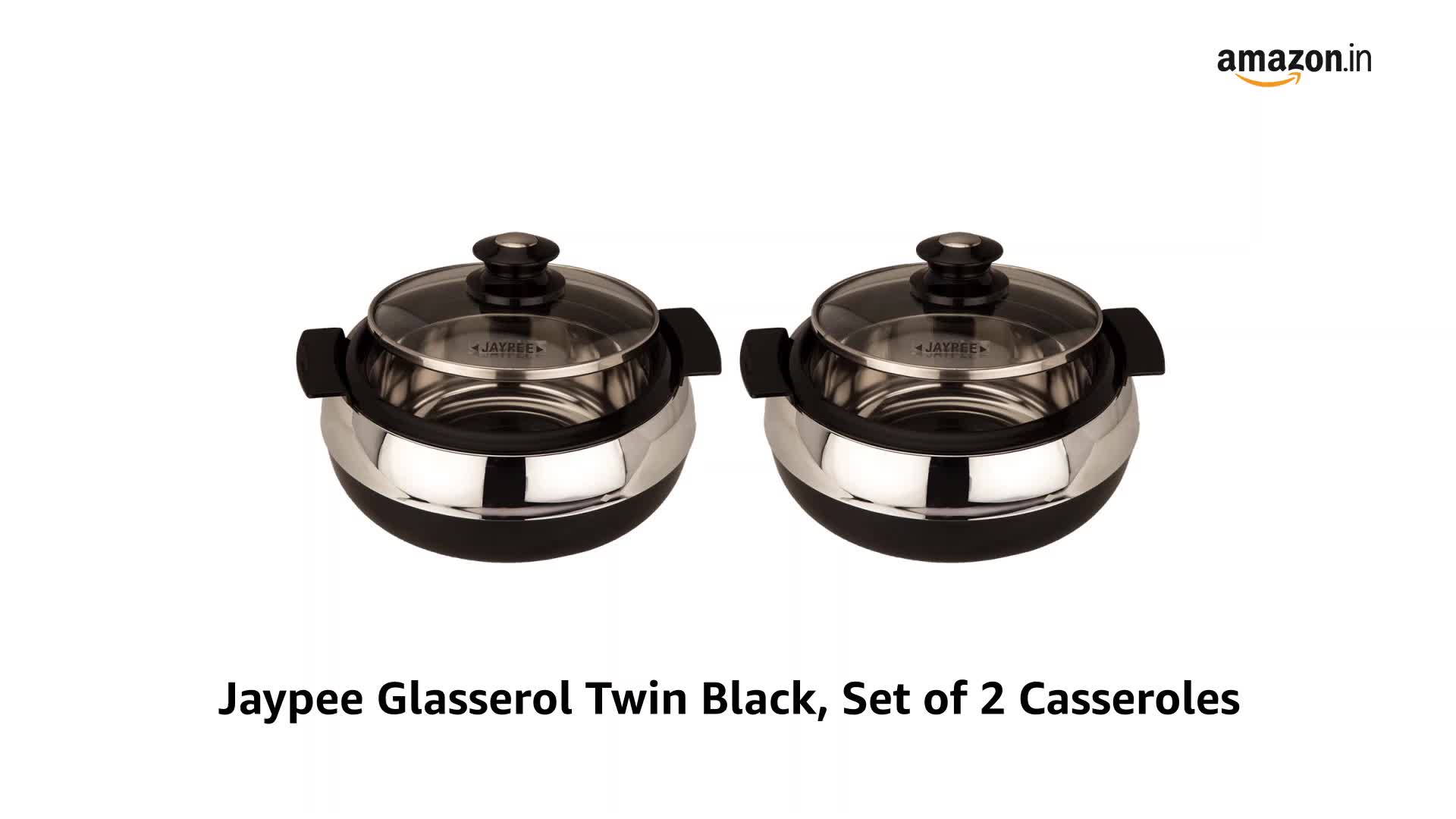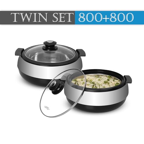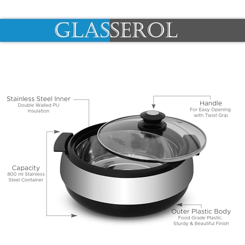 Jaypee Glasserol Serving Casserole Twin Set Inner Stainless Steel Toughened Glass Lid PUF Insulated Hot Box |Roti Box| Small Casserole | Easy to carry | Food Grade | Stackable, 800 ml + 800 ml, Black