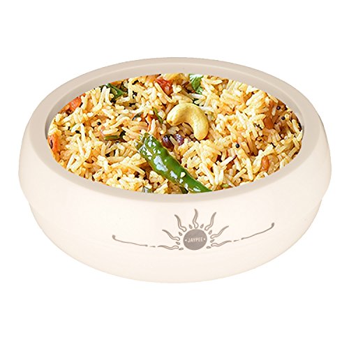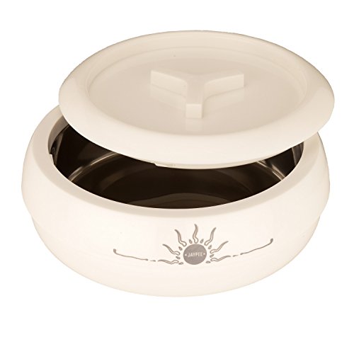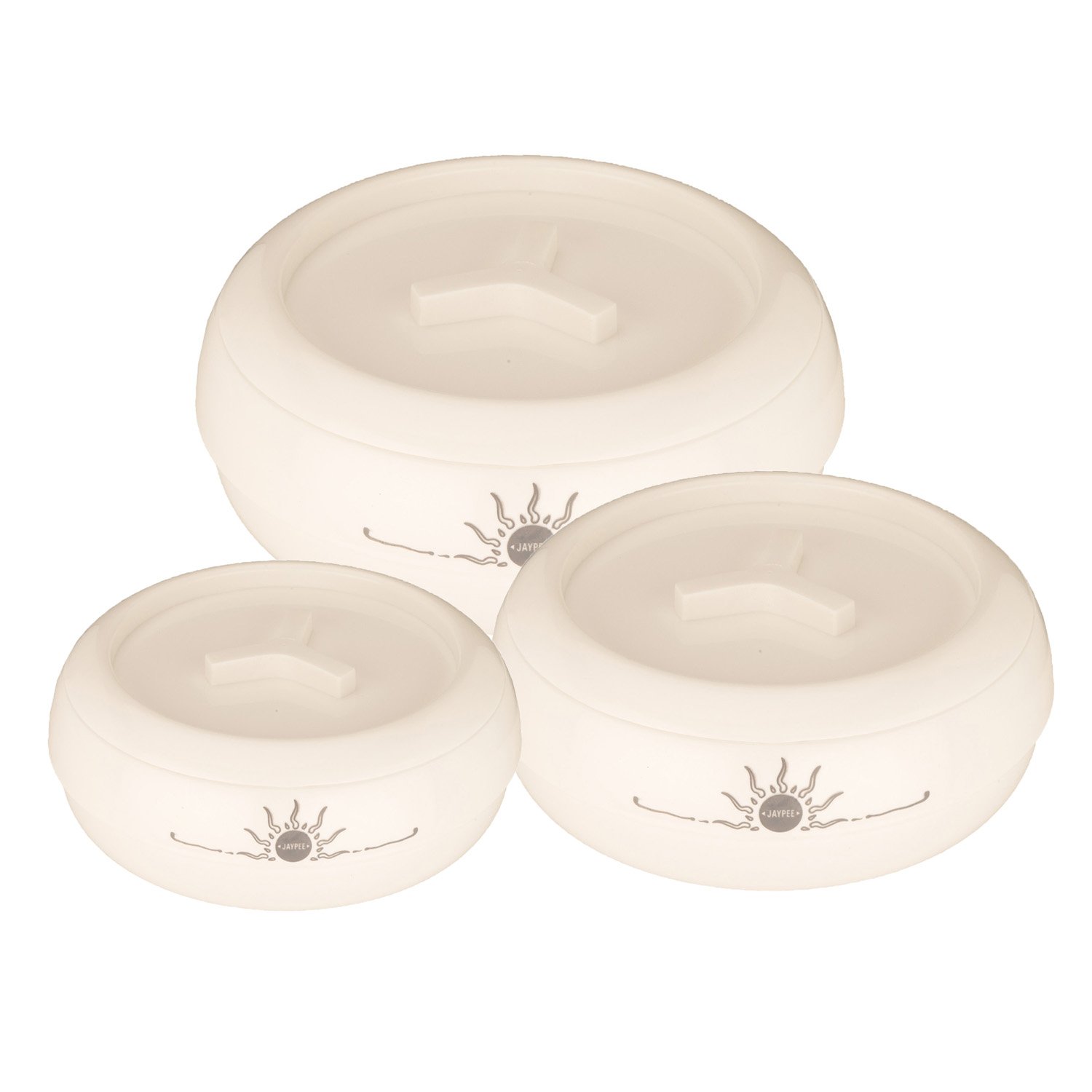 Jaypee Teen Bhoj Super Casserole set will stop your worries of keeping your food warm and fresh during your dinner. Itâs specially designed for Indian meals. The three different sizes (1200 ml 1500 ml and 2500 ml) are really handy and appropriate for serving multi cuisine in varying portions. The inner finished liner part is fabricated out of non-magnetic stainless steel sheet. The plastic outer body is moulded out of virgin food grade plastic with a sturdy and beautiful finish. With its unique finish it gives a sophisticated look which is one of a superlative essential in your kitchen collections. Material Used: Base Top and Cover-Polypropylene inside container-stainless steel Insulation-Polyurethane. Food grade BPA Free.