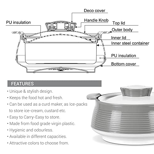 Milton Venice Casserole is made to preserve the freshness and warmth of your food for hours. The refined pastel colours and the striking design elevates your dining décor and thus makes it a must-have casserole for your home. Families across the country love to sit down for a family dinner and enjoy a good home cooked meal. A popular dinner dish that is easy to make and so versatile is the casserole. These casseroles are double-walled with a stainless-steel inner surface to keep food hot and fresh. This insulated casserole is simple to use and elegantly designed to take centre-stage at your dining table. It can be used for Salads chapatti Roti and it can also be used as a curd maker as Ice-packs to store ice-cream custard. The perfect serving casserole for any special occasions or household like day or anniversary parties holiday picnic.