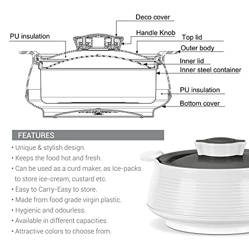 Milton Venice Casserole is made to preserve the freshness and warmth of your food for hours. The refined pastel colours and the striking design elevates your dining dcor and thus makes it a must-have casserole for your home. Families across the country love to sit down for a family dinner and enjoy a good home cooked meal. A popular dinner dish that is easy to make and so versatile is the casserole. These casseroles are double-walled with a stainless-steel inner surface to keep food hot and fresh. This insulated casserole is simple to use and elegantly designed to take centre-stage at your dining table. It can be used for Salads chapatti Roti and it can also be used as a curd maker as Ice-packs to ice-cream custard. The perfect serving casserole for any special occasions or household like birthday or anniversary parties holiday picnic.