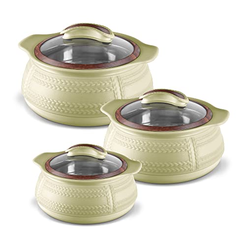 MILTON Weave Jr. Insulated Inner Stainless Steel Casserole with Glass Lid,Set of 3, (420 ml, 780 ml, 1.32 litres),Beige | BPA Free |Food Grade | Easy to Carry | Ideal for Chapatti | Roti | Curd Maker
