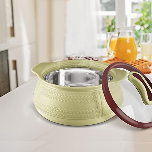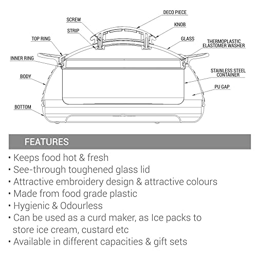 Weave casseroles feature a lockable glass-lid allowing you to see the contents inside. This double-walled casserole comes with stainless-steel inners to keep food hot and fresh for hours. Its sleek and attractive design (vacuum metallized / wooden prints) make it a must have to enhance your dining Decor. Families across the country love to sit down for a family dinner and enjoy a good home cooked meal. A popular dinner dish that is easy to make and so versatile is the casserole. This insulated casserole is simple to use and elegantly designed to take centre-stage at your dining table. It can be used for Salads chapatti Roti and it can also be used as a curd maker as Ice-packs to store ice-cream custard. The perfect serving casserole for any special occasions or household like birthday or anniversary parties holiday picnic. This Product Is Under 1 Year Warranty From The Date Of Retail Purchase Against Any Manufacturing Defects In Material And Workmanship. The Warranty Does Not Cover Damages Resulting From Accidents Mishandling Or Tampering With The Mechanism. Warranty Valid Against Producing Original Bill Endorsed By Seller.