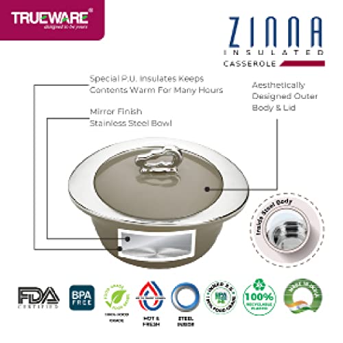 Trueware Zinna Plus casserole meal set is made out of best materials with exquisite chromed top break safe complete product. It makes lock cover lid. The internal body is made of high grade stainless steel of Casserole and lid. The plastic external body is shaped out of virgin food grade plastic (BPA free & FDA Approved). With an exceptional chrome finish it gives a modern look which is one of the standout basic in your kitchen assortments. We can purchase this item for high utility and gifting. Washing Instructions : Use mild detergent for washing. Dry thoroughly after washing. Clean the outer body with sponge instead of brush or scrub. General care : Do not attempt to separate the inner stainless steel container from its main body. Do not place the casserole over or in close proximity of fire. Tips for Optimum Use: Prior to storing hot food stuff pre-condition the Zinna Plus casserole by pouring a little hot water rinse and empty contents. Similarly for cold articles rinse with cold water. Transfer the food into the Zinna Plus casserole as soon as it is prepared. Store to full capacity. Do not use in Microwave. Special P.U. Insulates keeps contents warm for many hours. Mirrior Finish Stainless Steel Bowl. Aesthetically Designed Outer Body & Lid. Disclaimer : Do not use any kind of hard substance or scrubber to clean the inner or outer body of Casserole. Color may slightly different from the original product due to digital photography.