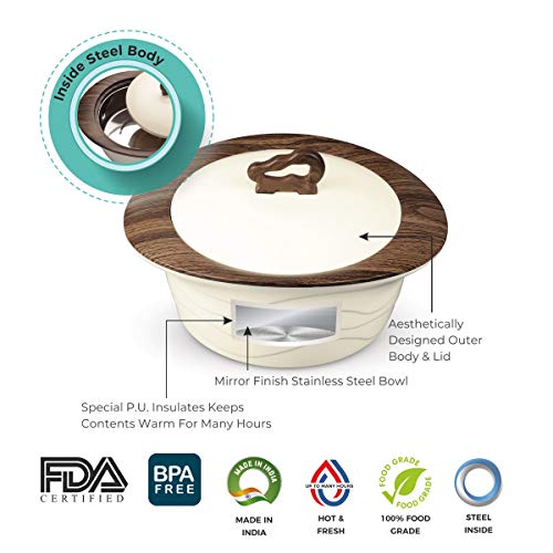 • Casserole set is made of food grade plastic material (BPA FREE & FDA Approved). High Grade Stainless Steel inside with PUFF insulation which keeps the food warm & fresh for longer hours.