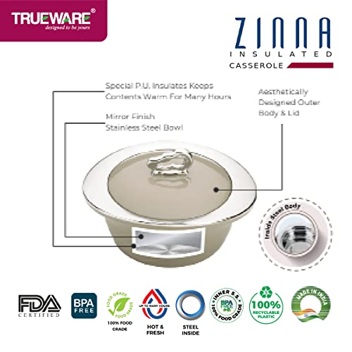 Trueware Zinna Plus casserole meal set is made out of best materials with exquisite chromed top break safe complete product. It makes lock cover lid. The internal body is made of high grade stainless steel of Casserole and lid. The plastic external body is shaped out of virgin food grade plastic (BPA free & FDA Approved). With an exceptional chrome finish it gives a modern look which is one of the standout basic in your kitchen assortments. We can purchase this item for high utility and gifting. Washing Instructions : Use mild detergent for washing. Dry thoroughly after washing. Clean the outer body with sponge instead of brush or scrub. General care : Do not attempt to separate the inner stainless steel container from its main body. Do not place the casserole over or in close proximity of fire. Tips for Optimum Use: Prior to storing hot food stuff pre-condition the Zinna Plus casserole by pouring a little hot water rinse and empty contents. Similarly for cold articles rinse with cold water. Transfer the food into the Zinna Plus casserole as soon as it is prepared. Store to full capacity. Do not use in Microwave. Special P.U. Insulates keeps contents warm for many hours. Mirrior Finish Stainless Steel Bowl. Aesthetically Designed Outer Body & Lid. Disclaimer : Do not use any kind of hard substance or scrubber to clean the inner or outer body of Casserole. Color may slightly different from the original product due to digital photography.