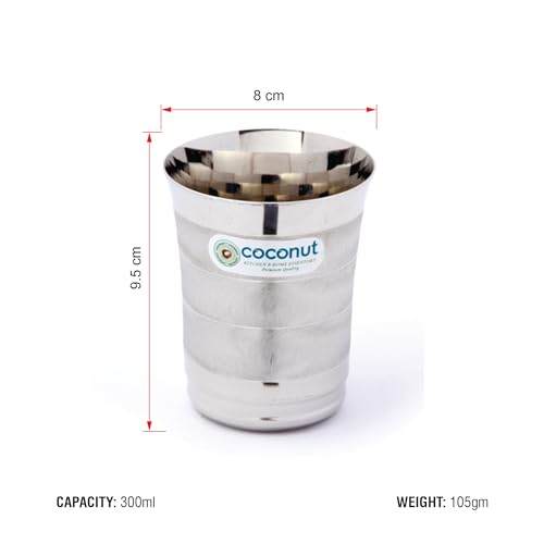 Coconut is range of innovative and quality products for home and kitchen. This set has been beautifully designed to add grace to your dining experience. This set is perfect for serving lemonade water juice etc. It is made from premium quality stainless steel and is absolutely durable. These glasses can be used at home as well as at hotels and restaurants. These can be easily cleaned and maintained. Capacity -300ML Each Glass. Product Dimensions : Width- 8 Cm Lenth -8Cm Hight -10 Cm.