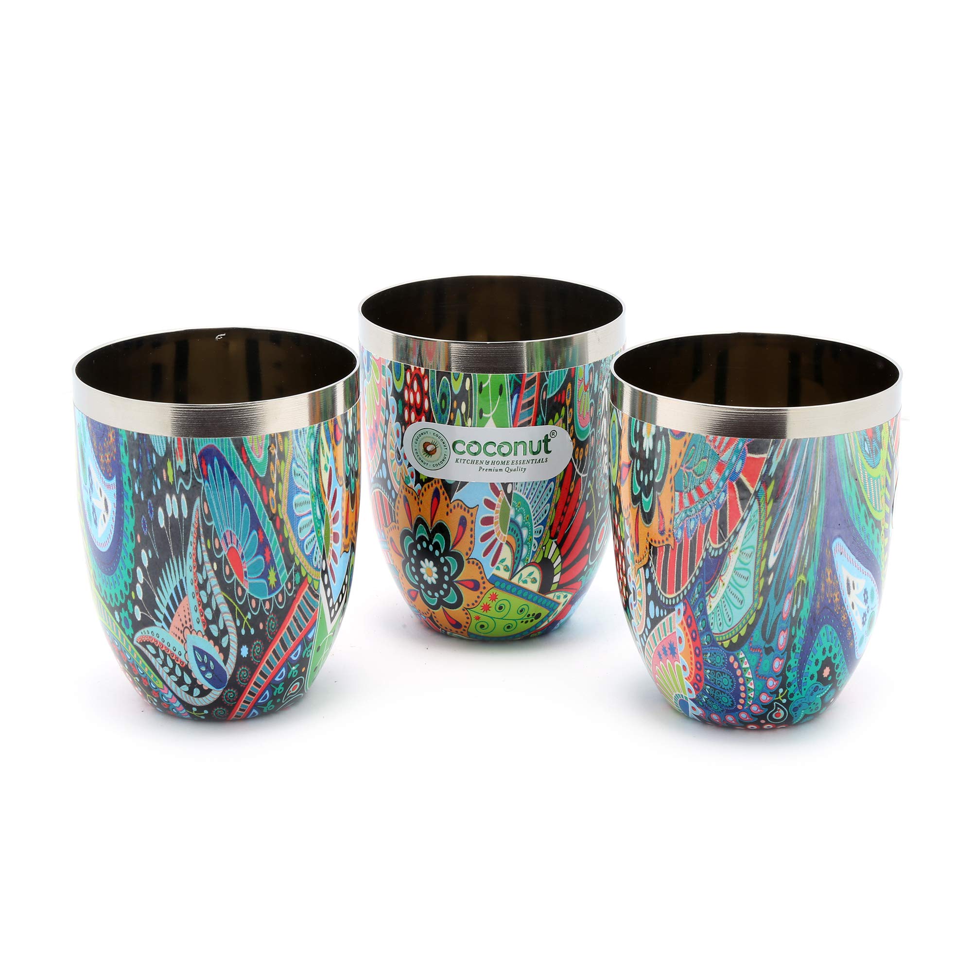 Coconut is range of innovative and quality products for home and kitchen. This set has been beautifully designed to add grace to your dining experience. This set is perfect for serving lemonade water juice etc. It is made from premium quality stainless steel and is absolutely durable. These glasses can be used at home as well as at hotels and restaurants. These can be easily cleaned and maintained. Capacity 300ML Each Glass. Product Dimensions : Width 8Cm Depth 8Cm Height 10 Cm. Product Content Coconut Stainless Steel Printed Designer Multi Colour Water Glass Set of 3.