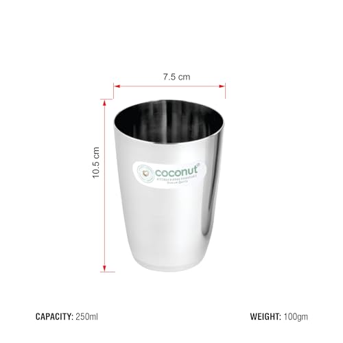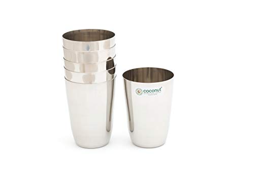 Coconut is range of innovative and products for Home and Kitchen. This set has been beautifully designed to add grace to your dining experience. This set is perfect for serving lemonade water juice etc. It is made from stainless steel and is absolutely durable. These Glasses can be used at home as well as at Hotels and restaurants. These can be easily cleaned and maintained. Product Content Coconut Stainless Steel Water Glass Set of 6 Glass Capacity -250ML Each Glass Dimension -Width -7.5 cm Height -10 Cm.