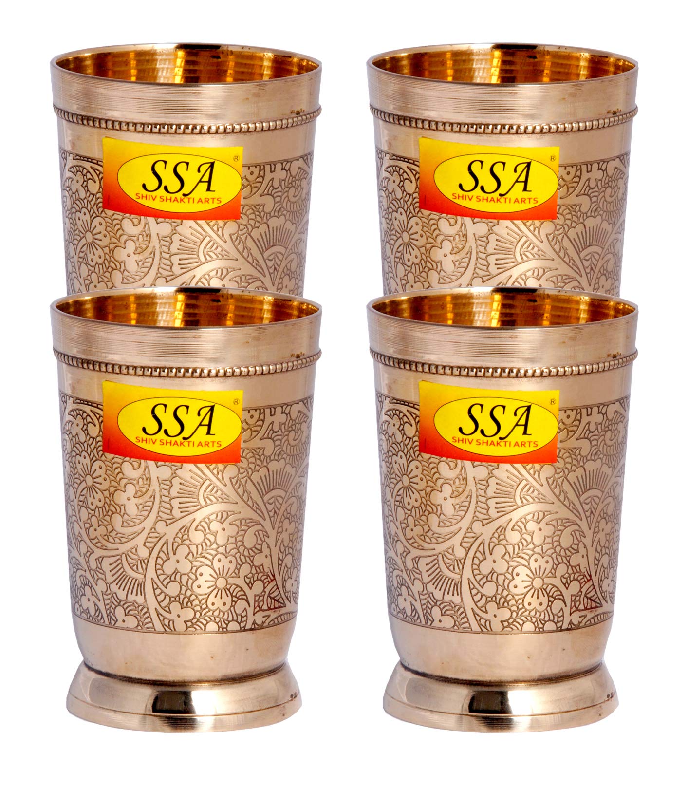 SHIV SHAKTI ARTS Brass Glass Tumbler Embossed Design300 ML EachSet of 4 | Brass Glass Set of 4 | Brass Utensils for Kitchen | Drinking Glass | Water Glasses | Perfect for Gifting |