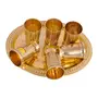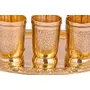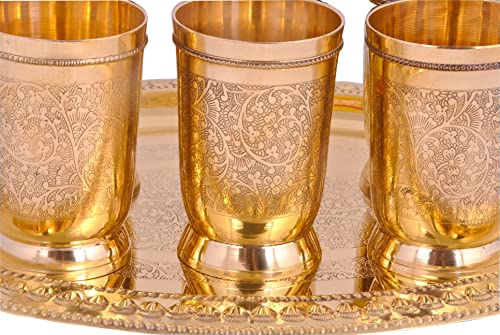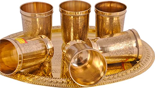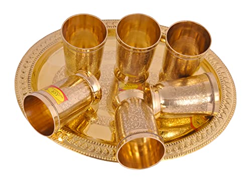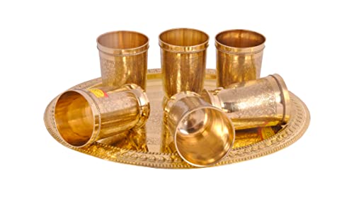 Shiv Shakti Arts® Pure Brass Serveware Set | Brass Tray with Glass | 7 Pieces Brass Dinner Set | Gifting Diwali Special