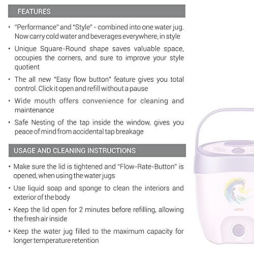 • Insulated water jug in unique Square-Round shape. It comes with a sturdy handle nested tap