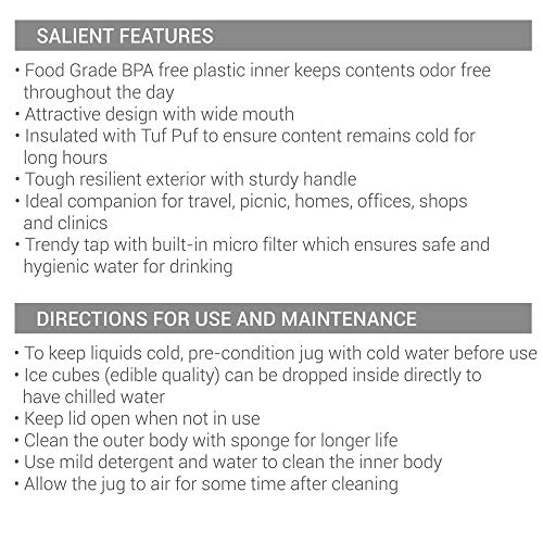 Milton Regal Tuff Jug is stylish durable and comes with insulated interiors to keep the beverage hot and cold for longer hours. Its wide mouth allows you to clean it conveniently and the screw-top lid provides for hassle-free cleaning. This product is ideal for serving and storing beverages like soup tea coffee and more. Dual tone finish insulated flask integrated handle for easy carrying. Keeps beverages hot or cold for hours screw-top lid allows liquid flow via spout. Contemporary dual-tone finish and body-graphics wide-mouthed for easy filling and cleaning. Leak-proof construction Hygienic and odour-free materials easy flow button for flow control. Enhance the look of your dining table with its exclusive shape and design. The perfect serving jug for any special occasions or household like birthday or anniversary parties holiday picnic. This Product Is Under 1 Year Warranty From The Date Of Retail Purchase Against Any Manufacturing Defects In Material And Workmanship. The Warranty Does Not Cover Damages Resulting From Accidents Mishandling Or Tampering With The Mechanism. Warranty Valid Against Producing Original Bill Endorsed By Seller.
