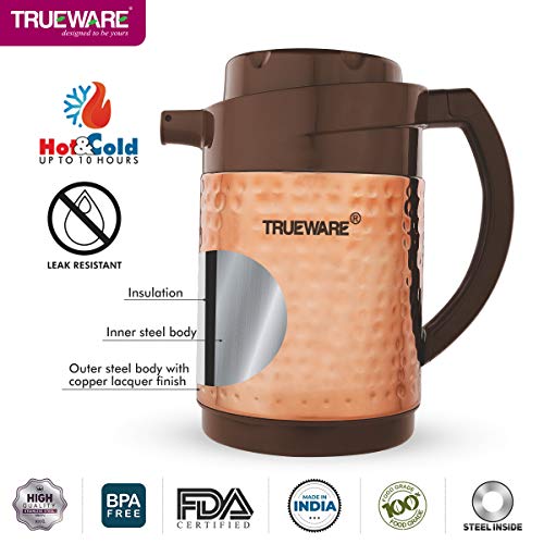 TRUEWARE PROUDLY PRESENTS THE PHOENIX FLASK Phoenix Insulated flask is designed to keep your beverages hot/cold for long hours. The Stainless steel body inner side and high grade hammered steel body with & without copper lacquer coating outside makes it an elegant looking flask. This flask keeps the non –carbonated beverages /liquids hot or cold for 6 to 10 hours depending on the usage. All over sealed body no point of any leakage or dripping while traveling or so… Smooth finished handle to grip it and pour your favorite beverages / liquids. It has inner –steel body which makes it Unbreakable. It is perfect for gifting purpose.
