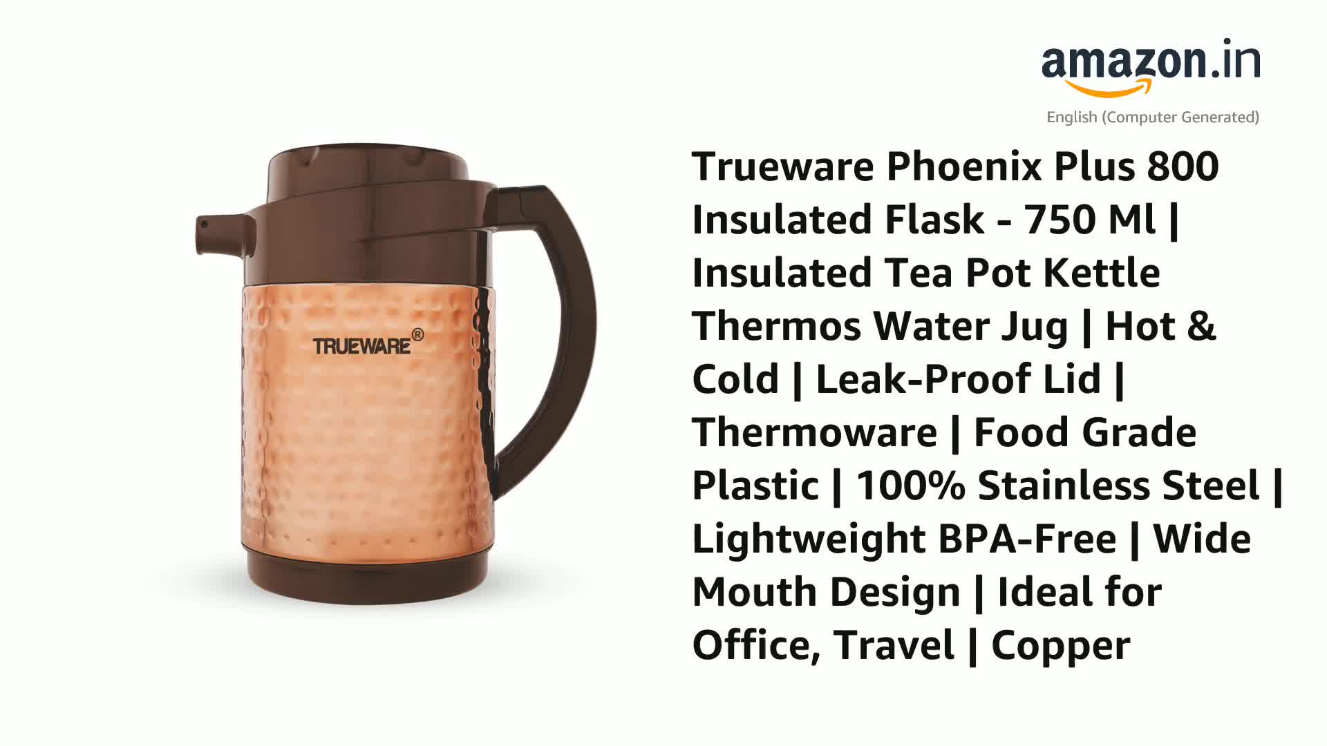 Trueware Phoenix Plus 800 Insulated Flask - 750 Ml | Insulated Tea Pot Kettle Thermos Water Jug | Hot & Cold | Leak-Proof Lid | Thermoware | Food Grade Plastic | 100% Stainless Steel | Lightweight BPA-Free | Wide Mouth Design | Ideal for Office, Travel |