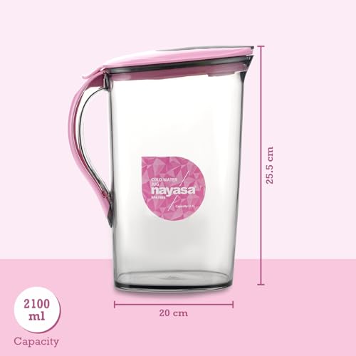 Nayasa Icon Jug- 2100 ML | Cold Water Jug with Lid | Study Handle | Press Lock Button to Open | Leakproof Lid | Strong & Flat Body | Glass Finish Look | Milk & Juice Beverage Carafes | Pink