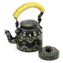 Ready to bring some history into your kitchen? This hand painted tea kettle, decorated with ancient stories, serves you some delightful ancient tea! Every tea stall in India has a tea kettle, but different then these kettles. These colourful tea kettles, made by Kaushalem are inspired by mythologies from Bihar. The kettles are painted in Madhubani style, a tribal art of Bihar. Each kettle describes a different story from a certain mythology.Every beautiful tea kettle is made with a brush and the colours were filled once the drawing was done.