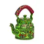 Ready to bring some history into your kitchen? This hand painted tea kettle, decorated with ancient stories, serves you some delightful ancient tea! Every tea stall in India has a tea kettle, but different then these kettles. These colourful tea kettles, made by Kaushalem are inspired by mythologies from Bihar. The kettles are painted in Madhubani style, a tribal art of Bihar. Each kettle describes a different story from a certain mythology.Every beautiful tea kettle is made with a brush and the colours were filled once the drawing was done.