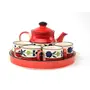 KHURJA POTTERY Handpainted Tea Kettle Set with 4 Cups & Tray Red & Blue Kettle 575 ml with 120ml tea cups (Ceramic)
