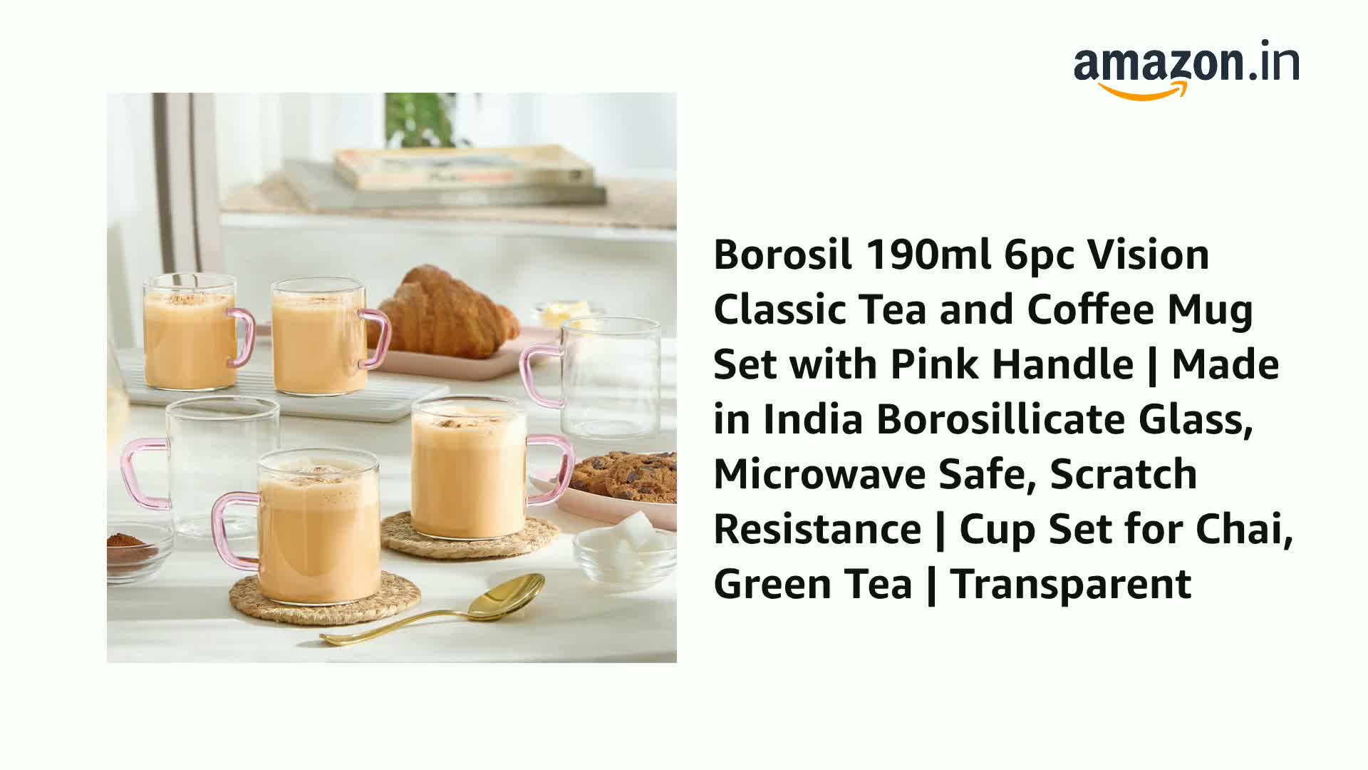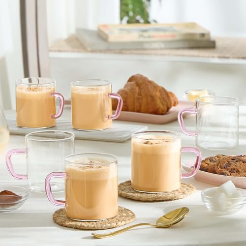 Borosil 190ml 6pc Vision Classic Tea and Coffee Mug Set with Pink Handle | Made in India Borosillicate Glass, Microwave Safe, Scratch Resistance | Cup Set for Chai, Green Tea | Transparent