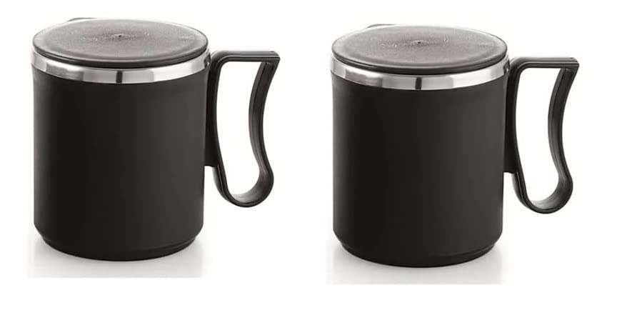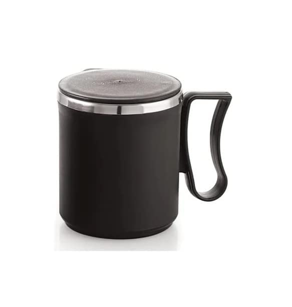 Unbreakable and odourless multipurpose mug which can be used to serve tea coffee and milk The unique style of steel tea coffee mug is double wall mug made of virgin plastic and non magnetic stainless steel with elegant look and comfortable handle It is ideal for gifting and traveling Designed with a carrying ring for easy transportation. The perfect size for most cup holders in cars or bicycles Vacuum insulation technology for maximum temperature retention hot or cold keeps liquids hot Product Dimension- 7.5x7.5x9 cm Capacity- 300 ml Color- Black Set of 2