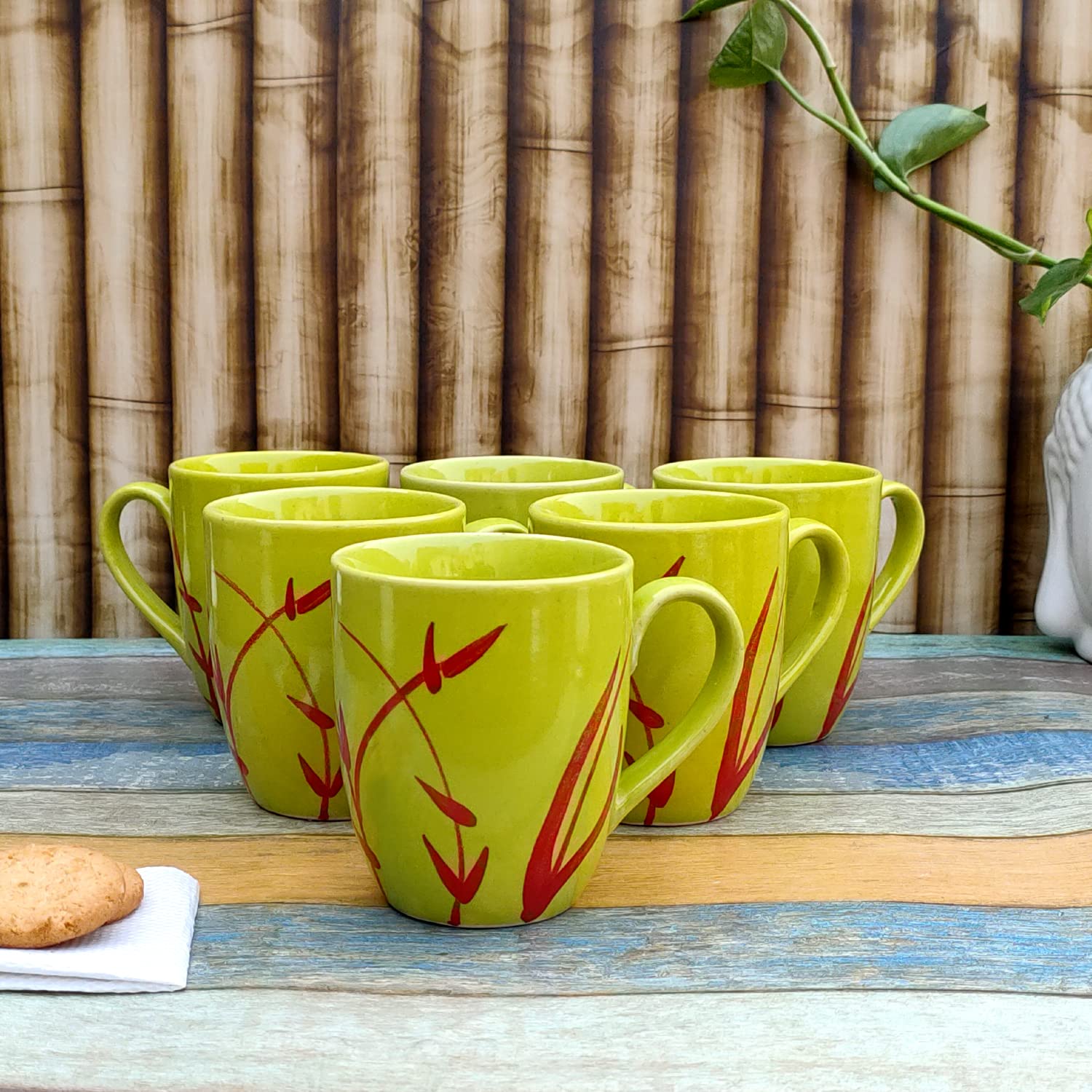 KHURJA POTTERY Coffee Tea Mugs Cups Set of 6 Studio Pottery Ceramic (Parrot Green 250 ml Each Microwave & Dishwasher Safe)