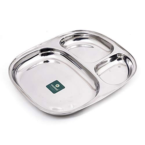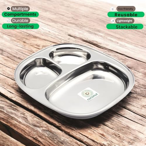 Coconut is a range of innovative and quality products for Home and Kitchen.This Dynasty Small Lunch/Dinner Plates has 2 Partitioned Sections which is made from Stainless Steel material and it has long durabality with Heavy Guage.It comes with nice design and Mirror Finish.It can be used to gift your friends and relatives for all occasions. Product content : Coconut Stainless Steel 2 Partition Dynasty Plate No. 3 - Dinner/Thali/Bhojan/Breakfast plates 2 Units.Dimension- Width -8 Inches Height - 10 Depth- 1 Inches.
