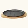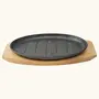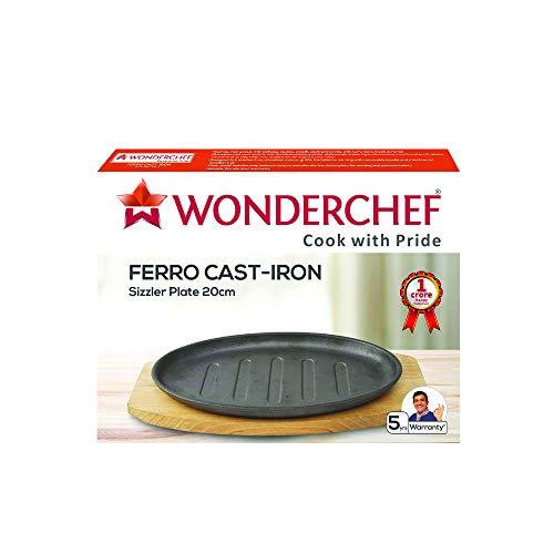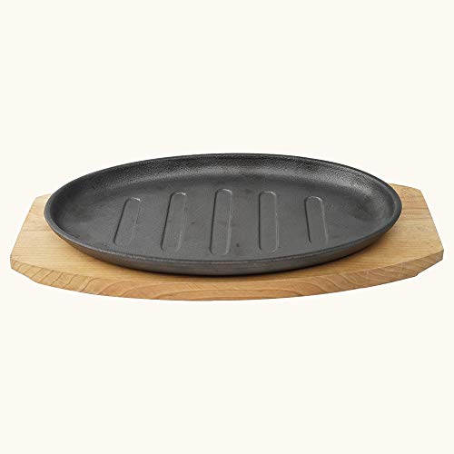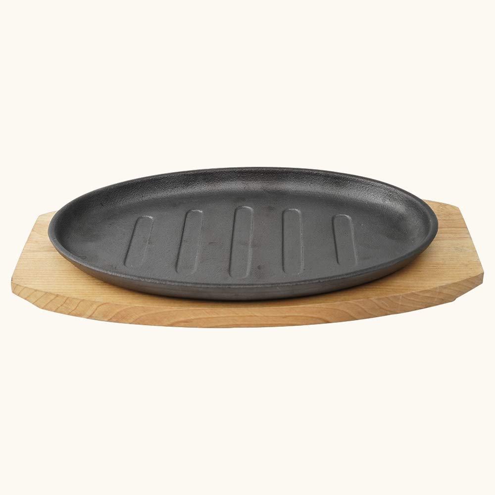 Size:20cmPre-seasoned and ready to use the heat-retaining sizzler plate excels at searing and browning and transfers and retains heat evenly to help keep your sizzlers hot throughout your meal. Designed to transition from stovetop oven or grill to the table for serving with removable handle and a heat-proof wooden tray. Heat-proof wooden tray makes it easy to transfer the hot sizzler plate for serving and protects tables.