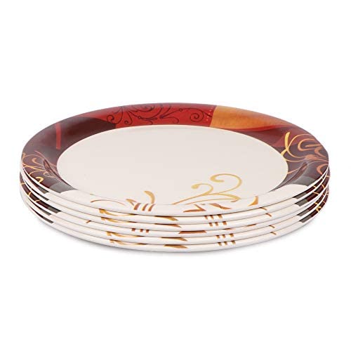 Get the posh and sophisticated feel of a rich dining experience in an expensive hotel right in the comfort of your home with this set of coloured Dinner Plates from "Golden Fish". Made of Melamine these round set of plates is lightweight & durable. Additional Benefits:- >> It is also dishwasher-safe making it easy for you to clean it without exhausting yourself >> Pack of 6. >> These dinner Plates includes six dinner plates and enough to set a beautiful dining table. >> Break resistant >> Dishwasher safe >> Stackable; Hygienic; Design and color will never faint >> Made from toughened extra-strong and scratch resistant material >> Colour: White Base with Printed Patterns Note:- Please note that computer monitors differ in the colors shown on the screen so actual product may be darker or lighter than anticipated.