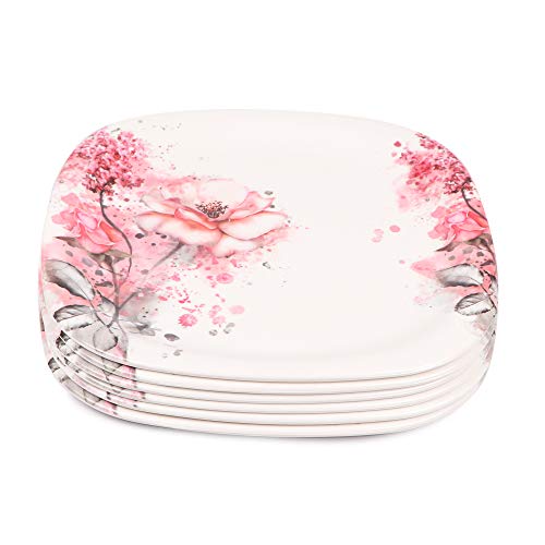 Golden Fish Unbreakable Melamine Square Full Size Rose Printed Dinner Plates (Set of 6) (GFNP-S-4)