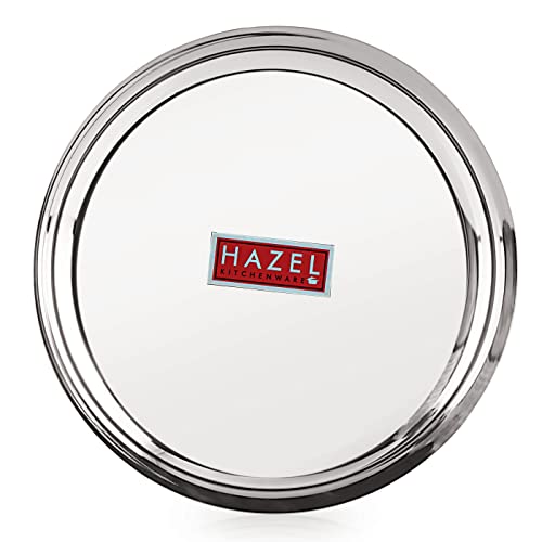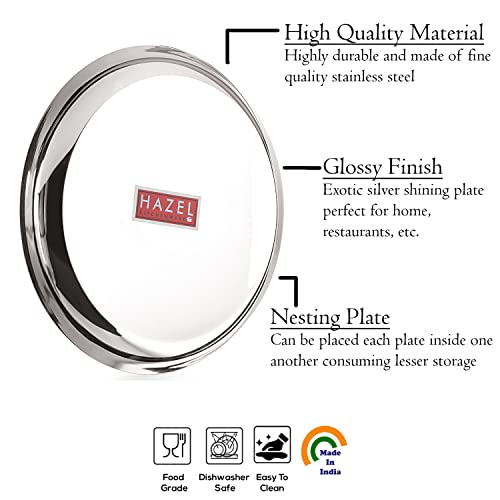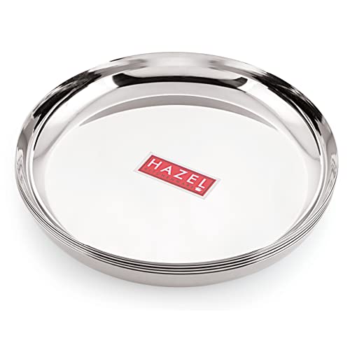 HAZEL Steel Plates For Lunch |Plates Set Steel For Dinner | Steel Plates Set 25 cm Set of 4 Featuring a set of 6 piece stainless steel dinner plate set. It is very economical in range made of food grade stainless steel. It is non breakable durable sturdy rust free and long lasting. Stainless steel is hygienic to use and easy to clean as compared to other materials. This set can be nested one into another and therefore helping save shelf space in the kitchen. This set is perfect for gifting purposes at weddings anniversaries. You get a magnificent dinner plate set at an extremely affordable price. Food served on this elegant dinner plate set improves the dinner table setting. This set is made from high quality stainless steel making it exclusive and durable. This set has been beautifully designed to add grace to your dining experience. Easy to clean and wash they have very exotic silver shining.An ideal plates to serve various food products on dinning table. Available in multiple sizes according to need of kitchen. Medium Thali / Plate Dimension : 25 x 25 x 3 cm (LxBxH)1 Year Manufacturer Warranty. This product is under 1 Year Warranty from the date of retail purchase against any manufacturing defects in material and workmanship. The Warranty does not cover damages resulting from accidents mishandling or tampering with the mechanism. Warranty valid against producing original bill endorsed by the seller.