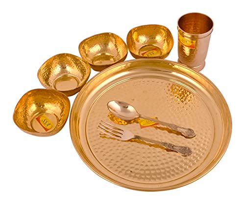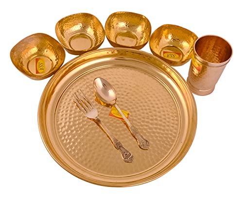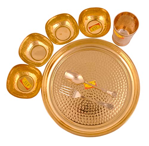 Shiv Shakti Arts Pure Brass Thali Set | Dinner Set | Luxury Hammer Design - 8 Pieces Brass Dinnerware Set for Gifting Diwali Spacial