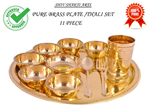 • Brass Thali Set 11 Piece (6 Bowl1 Glass1 Spoon1 Fork1Pudding Plate 1 Thali/plate) Material: Brass