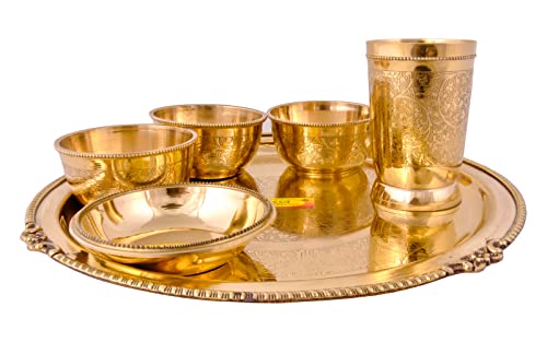 Shiv Shakti Arts® Pure Brass Thali Set | Dinner Set | 6 Pieces (Embossed Flower Eatching Design - Pital | Brass Dinnerware Set for Gifting Diwali Special.
