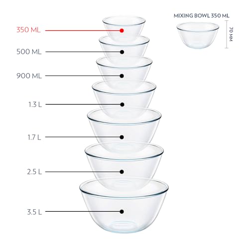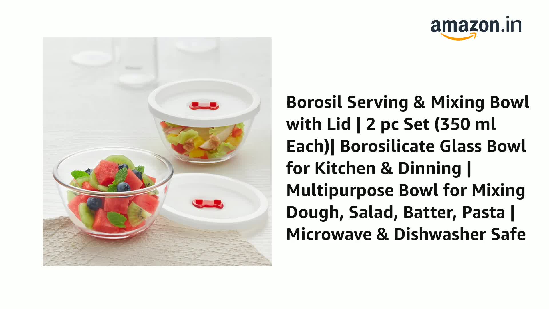Borosil 2pc Set of 350ml Round Shape Serving & Mixing Bowl with White Lid | Borosilicate Glass Bowl for Kitchen & Dinning | Bowl for Mixing Dough, Salad, Batter | Microwave & Dishwasher Safe