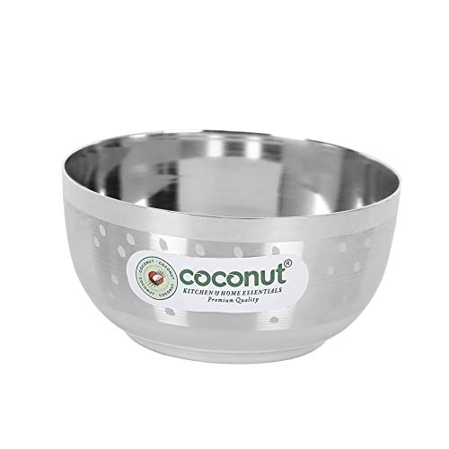 Coconut is a range of innovative and Products for Home and Kitchen.This Bowl is made from 100% Stainless Steel Food Grade Material. This Bowl set has been beautifully designed to add grace to your dinnerware collections. It is very Sturdy and Durable for long losting product. Easy to Clean and maintain with Mirror Finish which gives exotic silver shining. This Bowl is ideally used for Serving CurryDishes Vegetables Ice CreamsRaita Deserts etcs.Product Content : Coconut Stainless Steel C24 Bowl Size 5.5 12 Pieces of Bowls Capacity -250ML Each Bowl.