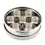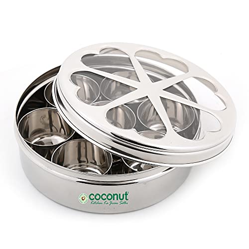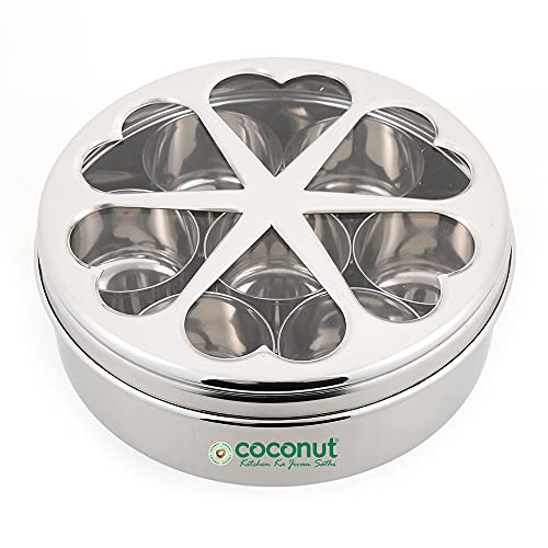 Coconut is a range of innovative and Products for Home and Kitchen. This is made from Stainless Steel material and its an essential product for all kitchen utilies. This Masala box comes with Carving Design with Mirror Glossy Finish for elegant look. This Masala box has seven bowl cups which can be stored spice items like Fenugreek Cloves Black cumin Indian BayCardomom Termeric Dals Channa Peanuts etcs. The product is food grade and Dishwasher Safe. Product Content - Coconut Floral Spice Container Small with 7 Bowls - 1 Unit. Product Dimension - Width -19 Cm and Height - 6.5Cm.