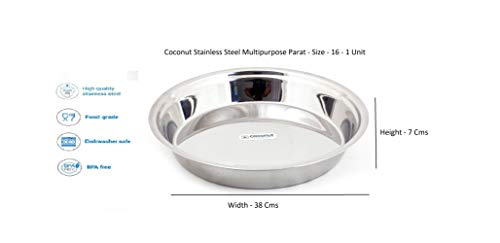Coconut is a range of innovative and products for Home and Kitchen. This Parat Bowl is made from 100 % Stainless Steel Material. This Bowl is ideally used for both Kitchenware and Pooja Room. Its an essential utility multipurpose bowl which can be used for Mixing Food items Serving Storing Food items. This Parat can be used as Lid Cover to Close the Water Pot Drums Storage Drums Etc. This parat is also used Hotels Temples Party halls. Product Content: SS Parat - 1 Quantity - Size -16 Dimensions - Width - 38 Cms & Height - 7 Cm