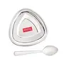 HAZEL Stainless Steel Serving Bowls Set With Spoon| Triangular Shaped Vati Katori Set of 1 | Fancy Serving Bowls For Snacks (1 Vati 1 Spoon) Capacity 250ml Each Silver This set has been beautifully designed to add grace to your dining experience. This bowl has elegant design which can suit any type of dinnerware collection. These bowls are made from stainless steel which prevents the bowls from rusting. Durable and attractive glass bowls. This set is made from high quality stainless steel making it exclusive and durable. This set has been beautifully designed to add grace to your dining experience. Easy to clean and wash they have very exotic silver shining. Easy to Clean Serving bowls. For storing and Mixing of ingredients. Use for Fruit Ice Cream Pudding Serving Kheer Dessert. This is a perfect gifting set at housewarming get-togethers weddings birthday parties and other occasions. Easy to clean and wash they have very exotic silver shining. It can be a great option for everyday use. Useful for storing or serving. When not in used each vatti can be stacked inside another vatti consuming lesser storage space.Compaq size makes it easy to store in kitchen cupboards. This Bowl can be easily cleaned and maintained. Vati Dimension : 12 x 12 x 3 cm (LxBxH) Weight : 100 Grams Capacity : 250 ML. Spoon Dimension : 13.5 x 3 x 0.1 cm (LxBxH) Weight : 30 Grams. 6 Months Manufacturer Warranty. This product is under 6 Months Warranty from the date of retail purchase against any manufacturing defects in material and workmanship. The Warranty does not cover damages resulting from accidents mishandling or tampering with the mechanism. Warranty valid against producing original bill endorsed by the seller.