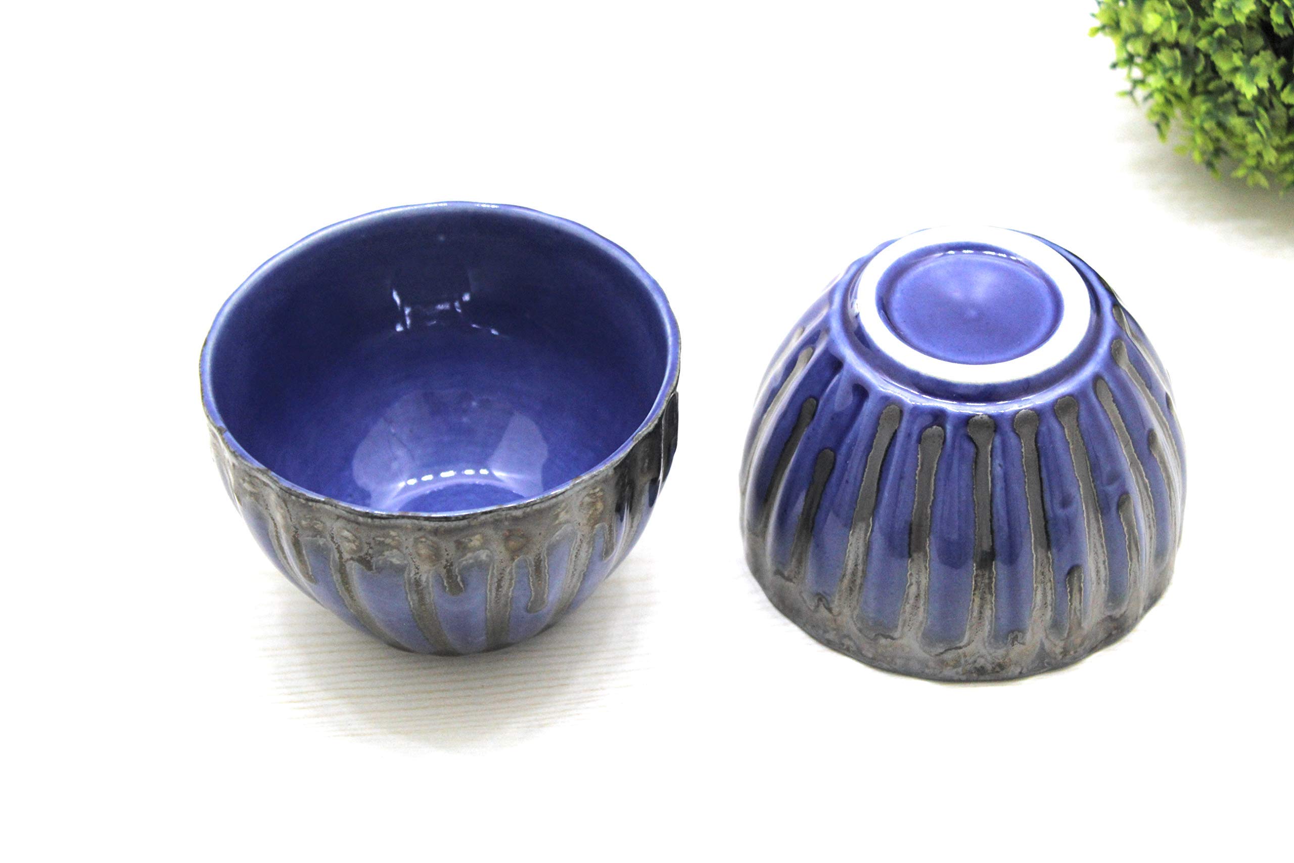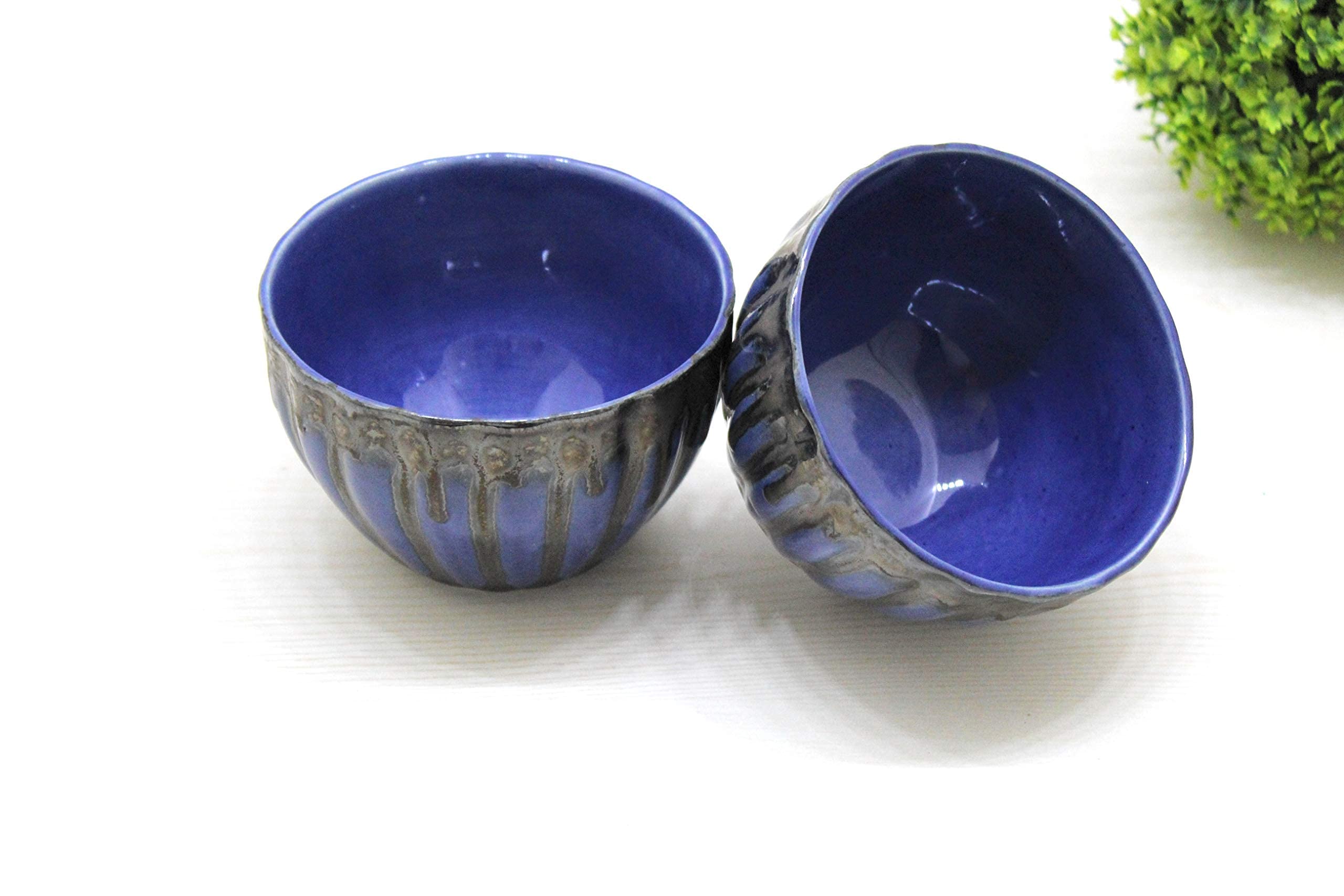 These KHURJA POTTERY ceramic round bowls are handmade and handpainted by Indian artisans. The capacity of each bowl is 240ml. As the bowl is handcrafted there may be a slight difference in color and finish or few pinholes may occur; however this does not change product quality in any way. These medium size bowls are made of ceramic and so they are non-toxic non-reactive can retain heat for a long time and do not catch the flavour or colour of the product put in them. They are also easy to clean and lasts for years. They are also dishwasher safe on the mild cycle. These big ceramic bowls are also lightweight Microwave Oven Freezer OTG safe and chip resistant and so act as bakeware too. Large size of these ceramic mixing bowls makes them perfect for multipurpose uses. The ceramic bowls are perfect to bake or serve various food dishes like salad soup dal rice pasta curry/gravy Maggi noodles desserts snacks sauces or chutneys. The color available is blue with dark blue colour drips. The beautiful design makes them perfect for any setting and their stylish look also makes them a wonderful gift for your loved ones who are moving into their new home or love eating out of pretty bowls. They go perfect with a boho nordic or colorful house theme. Serve your breakfast lunch or dinner in style. The product's description and images are copyright of KHURJA POTTERY. It is a request that is not copied or altered. We promise to give you the best product and service. In case you have questions or problems with our product do not hesitate to contact our store. If you are interested to see more of our product range search "KHURJA POTTERY" in the search bar.