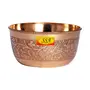 Highly Durable Pure Brass Embossed/Karvi Design Katori / Bowls Dimension : 4.5 x 8.8 cm (Height x Width) Debth - 4.3 cm Capacity - 150 ML Each Approx Weight - 170 Gm Each Approx Diameter Of Top - 8.8 cm Diameter Of Base - 6 cm.
