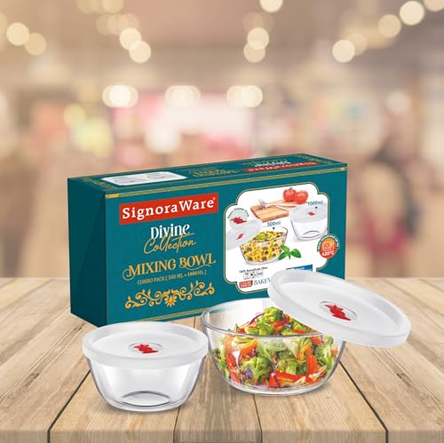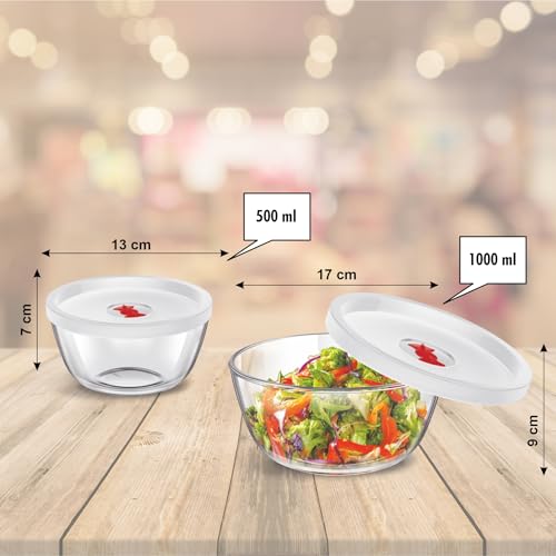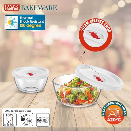 SignoraWare Borosilicate Glass Mixing Bowls and Serving Bowls Set with Lid and Steam release Knob, Micro Wave Oven Safe (500ml+1000ml, Set Of 2 Piece, Transparent Clear)