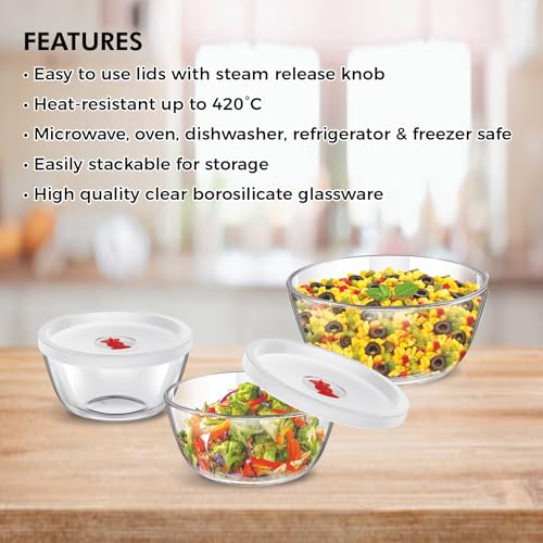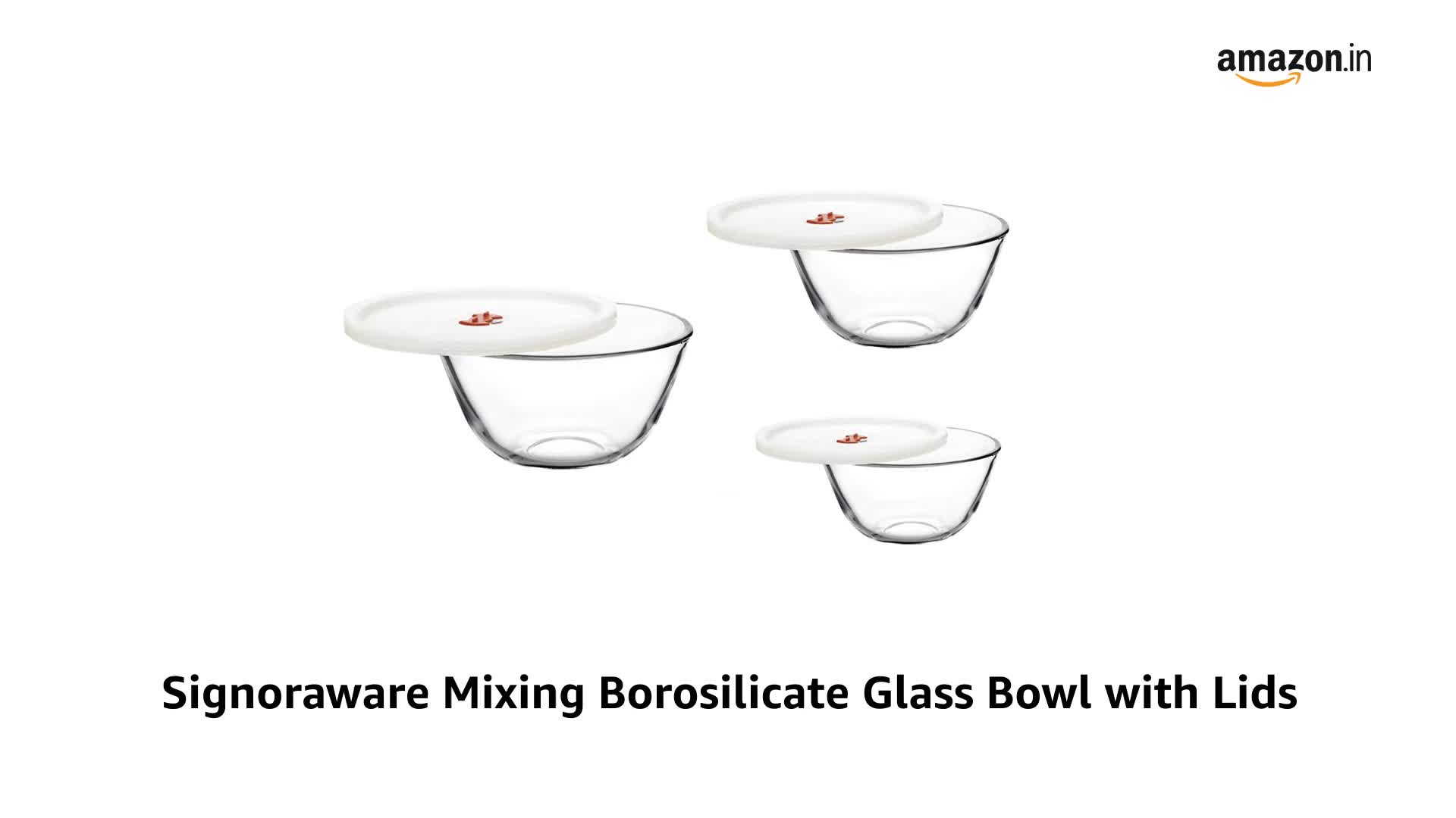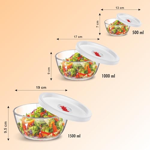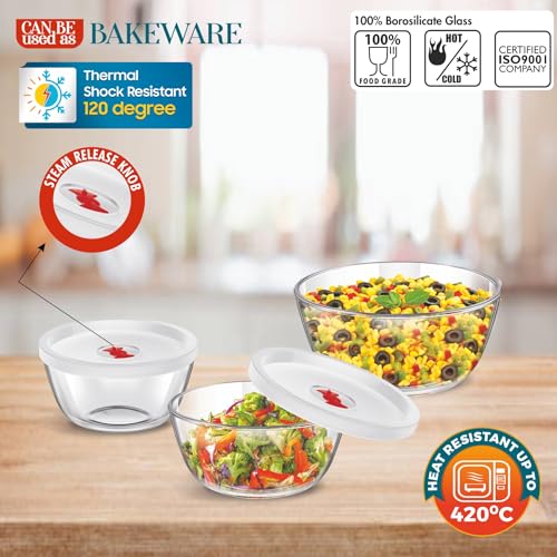 SignoraWare Borosilicate Glass Mixing Bowl with Lid | Steam release Knob | Stain Resistant | Microwave safe | Best for Mixing Ingredients | Baking & Serving ( 500ml + 1 Ltr + 1.5 Ltr | Clear )