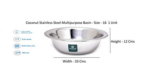 Coconut is a range of innovative and quality products for Home and Kitchen. This Basin Multipurpose Bowl is made from 22 Guage Stainless Steel Material. It's a Food Grade which will not react to the food. This is Easy to clean and maintain. This Multipurpose Basin is an essential product for kitchenware collections. This is ideally used to make Chapati Poori Parota Vegetables etc. It can also be used as a Food Serving /Food Storage in all the occasions and functions at Home. This Basin is usually used in HotelsTemplesParty Halls Etc. Product Content: SS Basin 22 Guage - 1 Quantity - Size -16 Dimensions - Width - 13 Inches & Height - 4.25 Inches.