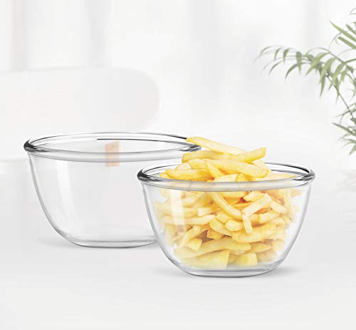 Mix anything from cake batter to salads to eggs to sauces and everything in between these versatile borosilicate bowls will quickly become your go-to food prep dishes! Because they are borosilicate glass they will not leech unhealthy chemicals into your food and they will not stain or absorb odors. It's Ideal for cooking Cake Pasta Vegetables etc.