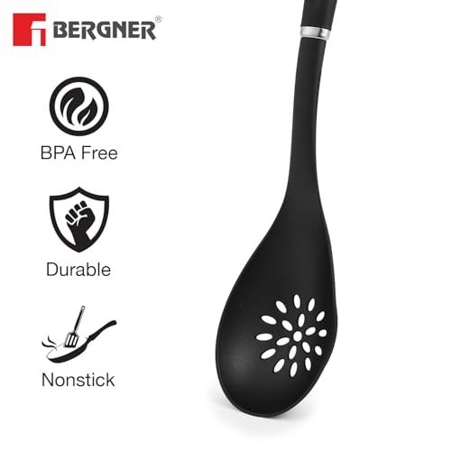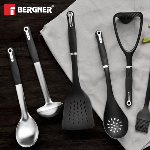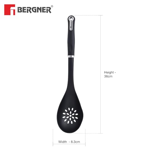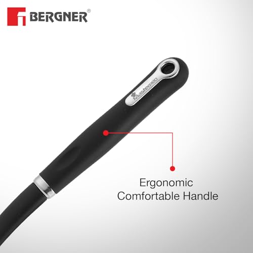 A slotted spoon is a specialized spoon with narrow holes in it to drain the excess liquid from various kinds of foods. It is a very helpful tool for any chef and Bergner brings it to you in the highest quality. A nylon body to provide durability and a lightweight feel for your comfort. Special care has been given to your safety with its heat-resistant silicone cover. Non-scratch design ergonomic handle and hanging loop make this slotted spoon convenient to use in your daily kitchen activities. Master Pro Range is a leap forward in kitchen cookware technology. Thoughtfully designed with a multi-layer of stainless steel aluminum and copper to help you become a master of the cooking realm. These highly durable materials offer long-lasting usability for your convenience. It will aid in the proper optimization of heat distribution and energy consumption all the while creating tasty and nutritious food. Comes in a premium and modern design to provide the elegance you've always desired in your kitchen. So get ready to feel like a master chef and order one now!