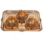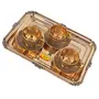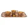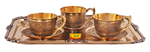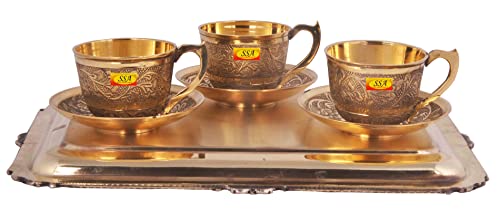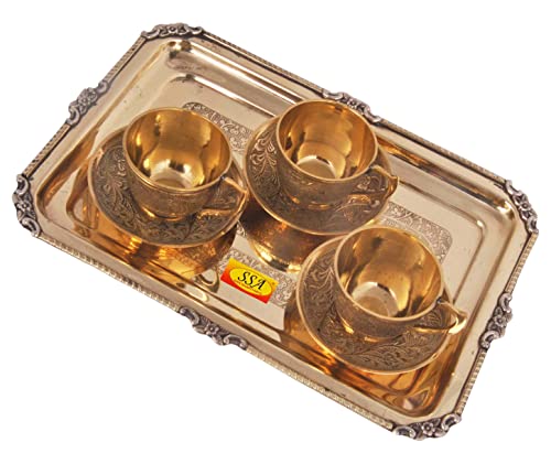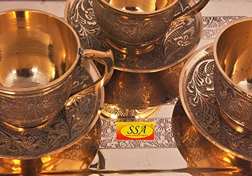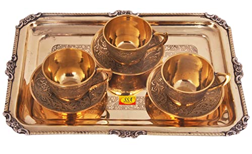 SHIV SHAKTI ARTS Pure Brass Karvi Eatching Design Serving Tray with Brass Tea Cup and Saucer Set (150 mlBrassGold) New Year Diwali Gift Item