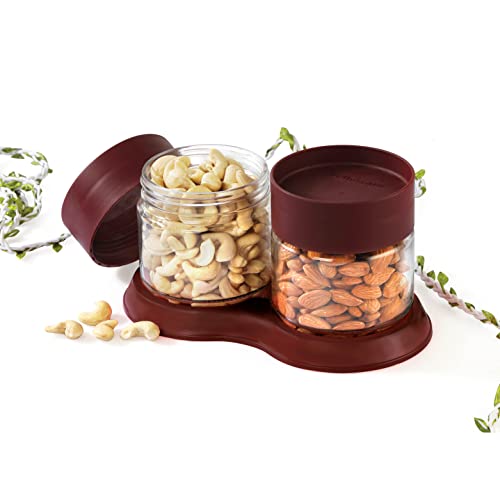 CELLO Modustack Glassy Tray Set | Glass Jar with Lid & Tray | Air Tight Steel Lid and Stackable | For Storage of Food, Pulses, Spice, Cereals, Cookies, Dry Food | Set of 2 | 500ml, Maroon