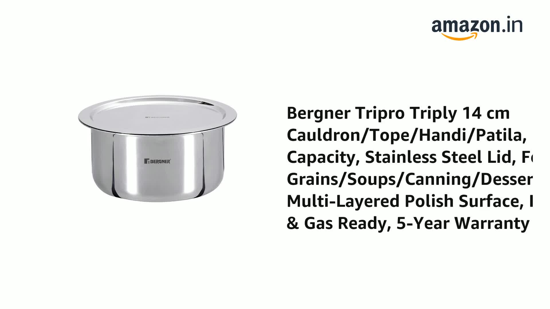 Bergner TriPro Tri-Ply Stainless Steel 14cm Tope with Lid, Patila with Stainless Steel Lid, 1.3L Tope with Lid, Induction Base and Gas Ready, Easy-use Flared Rim, 5-Year Warranty by Bergner