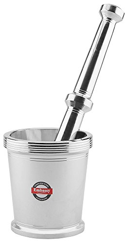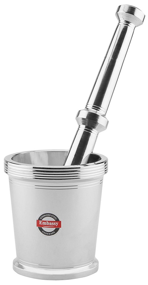 Embassy masher or mortar pestle or kutani (khal batta) is made of stainless steel and is extremely sturdy and durable. The product is heavy and comes in an attractive design. It is easy to use and clean or maintain. Used for grinding or crushing or mixing spices dryfruit is etc. It is available in 3 sizes - size 1 (150ml) size 2 (200ml) and size 4 (350ml).